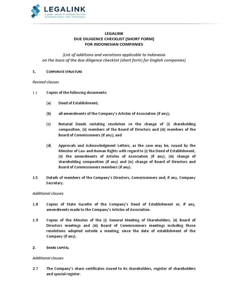 法務デューデリジェンス(Legal Due Diligence)は、買収対象企業の法的リスクを精査するプロセスです。インドネシアでは、会社法(Law No.40/2007)に基づく定款整備状況、株主構成、取締役構成、過去の株式譲渡履歴、訴訟リスク、契約書の有効性などを詳細に確認します。